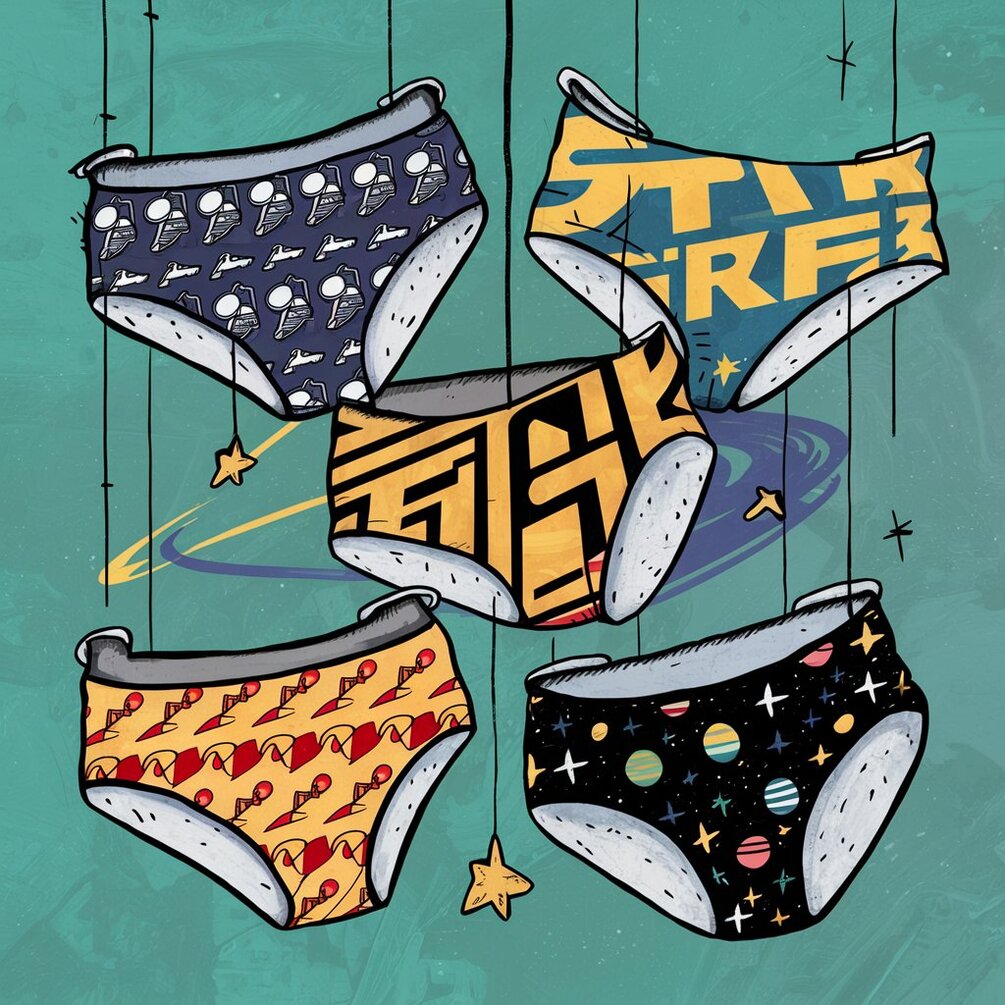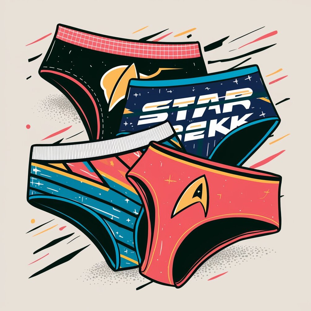 1. A vibrant and playful illustration of a set of three Star Trek-themed panties. Each panty features a unique design: one with the Star Trek logo, one with an iconic starship, and one with a bold interstellar pattern. The colors are bright and eye-catching, with a mix of blues, yellows, and reds. The overall design exudes a sense of fun and nostalgia for Star Trek fans., illustration